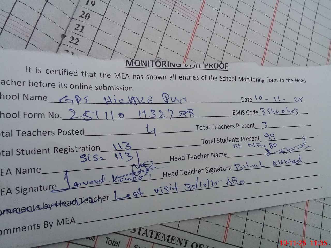 | Attendance Register | Head Teacher | MEA with School | Visit Proof |