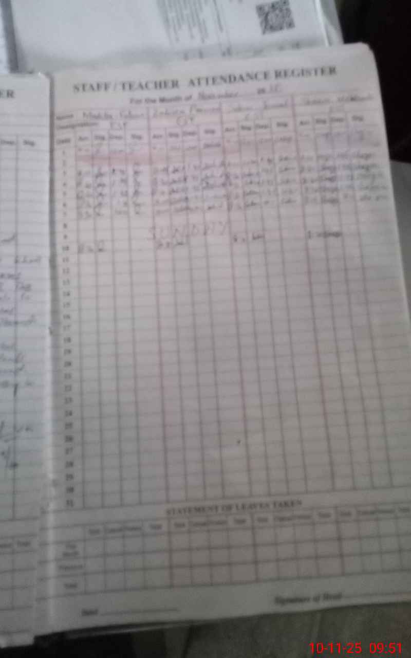 | Remarks (Use Separate Page if Required): Teacher Afifa Khan PST and teacher Hifza Tariq PST attendance blank and she was not physically present in school so according to monitoring sop mark her Absent Bilawi Shamim on casual leave as per register but her Sanctioned casual leave was not available in school so according to monitoring sop mark her Absent Sweeper Ejaaz attendance blank on attendance register he came in school late after my arrival so according to monitoring sop mark him Absent SG Haseeb kazmi on casual leave but his sanctioned casual leave was not available in school so according to monitoring sop mark him Absent NQ Bashir Ahmad attendance mark present and time mentioned 0800 hrs but he came in school after my arrival at 0930 hrs so according to monitoring sop mark him Absent | |||||