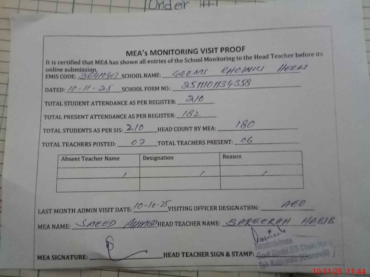 | Attendance Register | Head Teacher | MEA with School | Visit Proof |
