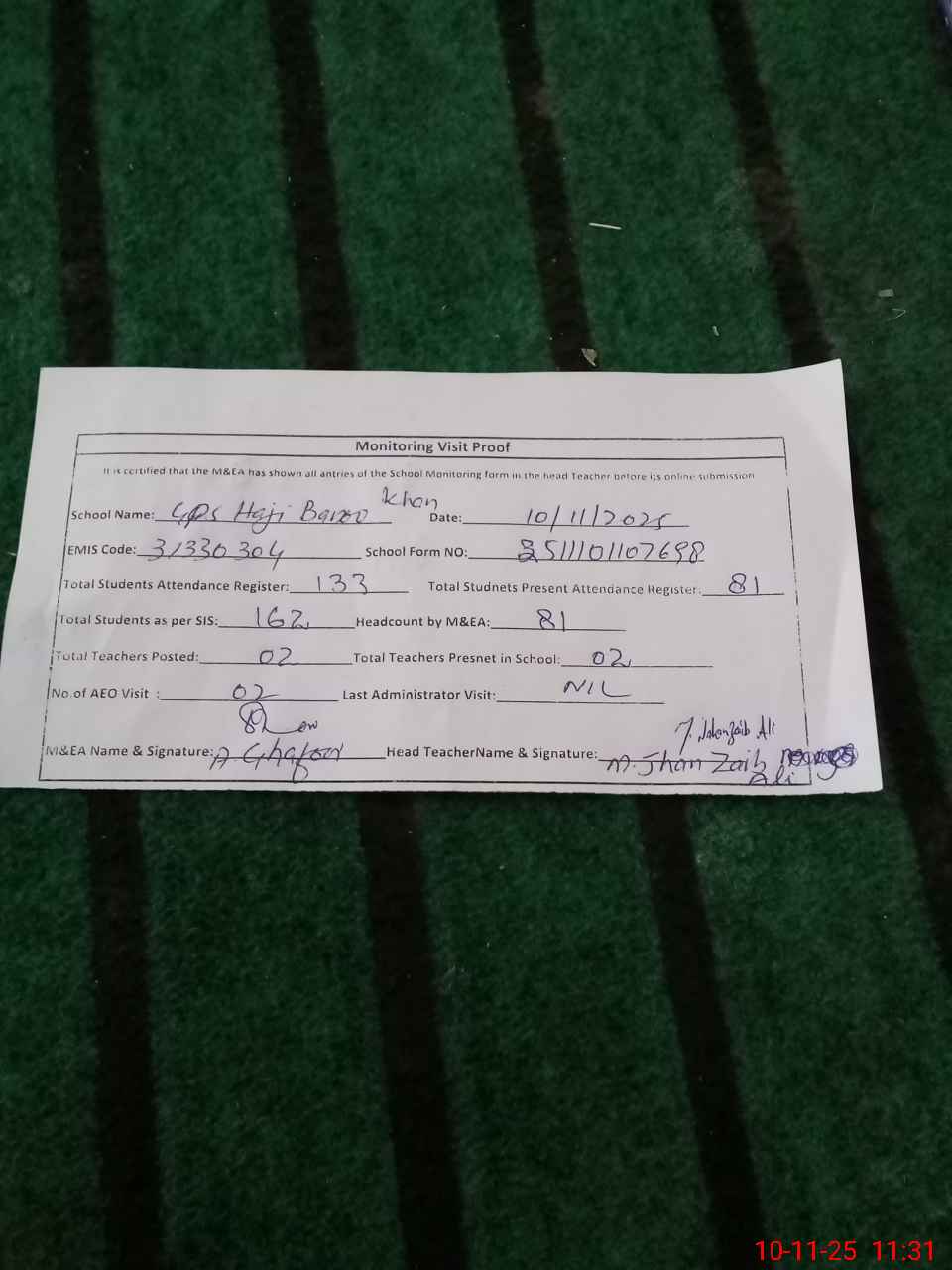 | Attendance Register | Head Teacher | MEA with School | Visit Proof |