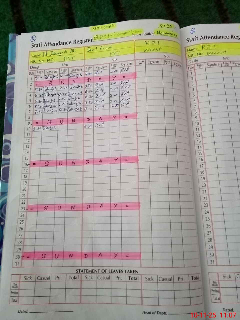 | CNIC | Full Name | Designation | R/C | Absence During Last Calender Month |