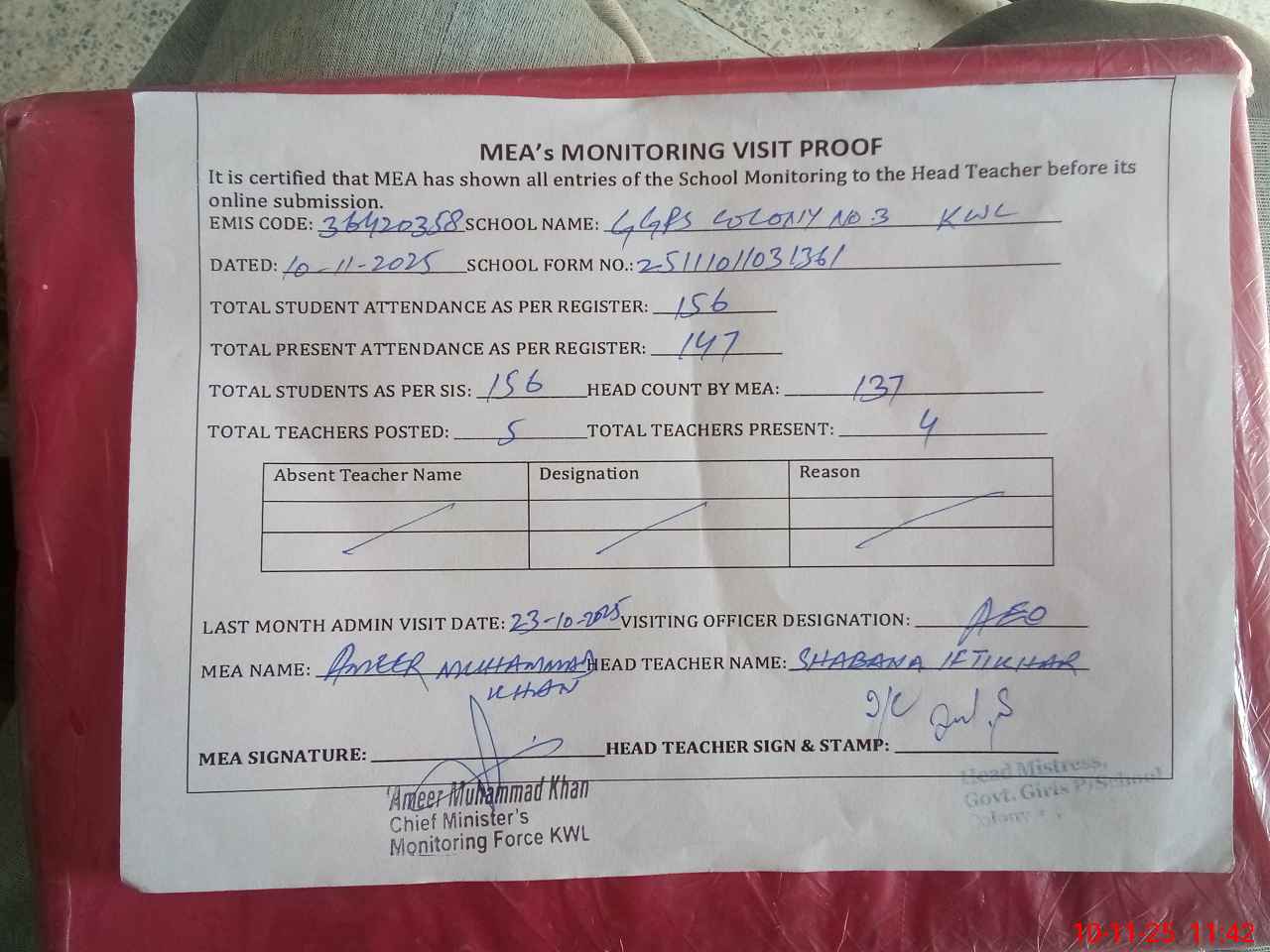 | Attendance Register | Head Teacher | MEA with School | Visit Proof |