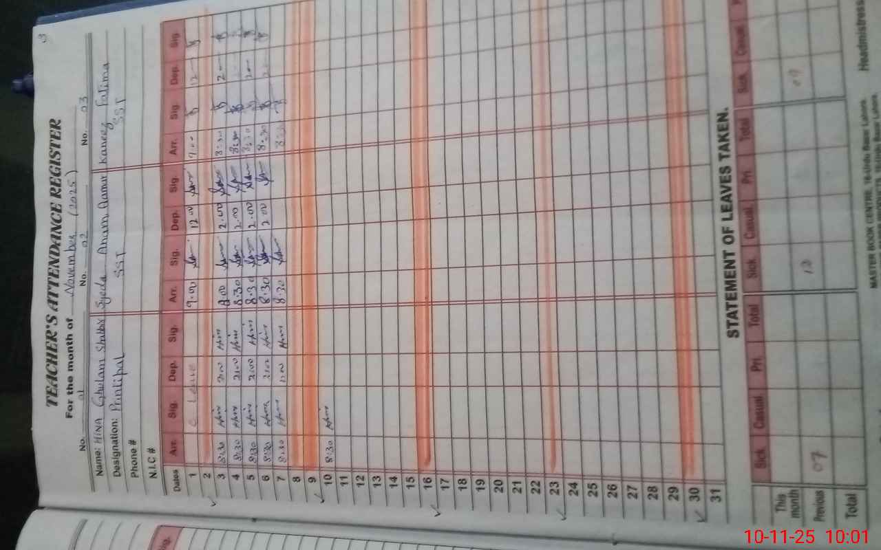 | CNIC | Full Name | Designation | R/C | Absence During Last Calender Month |