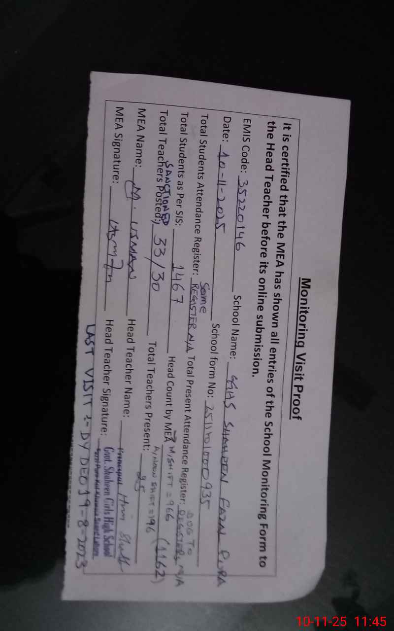 | EMIS Code: 35220146 | Name of School: GGHS SHAHEEN FAZAL PURA KOT KHAWAJA SAEED | |||