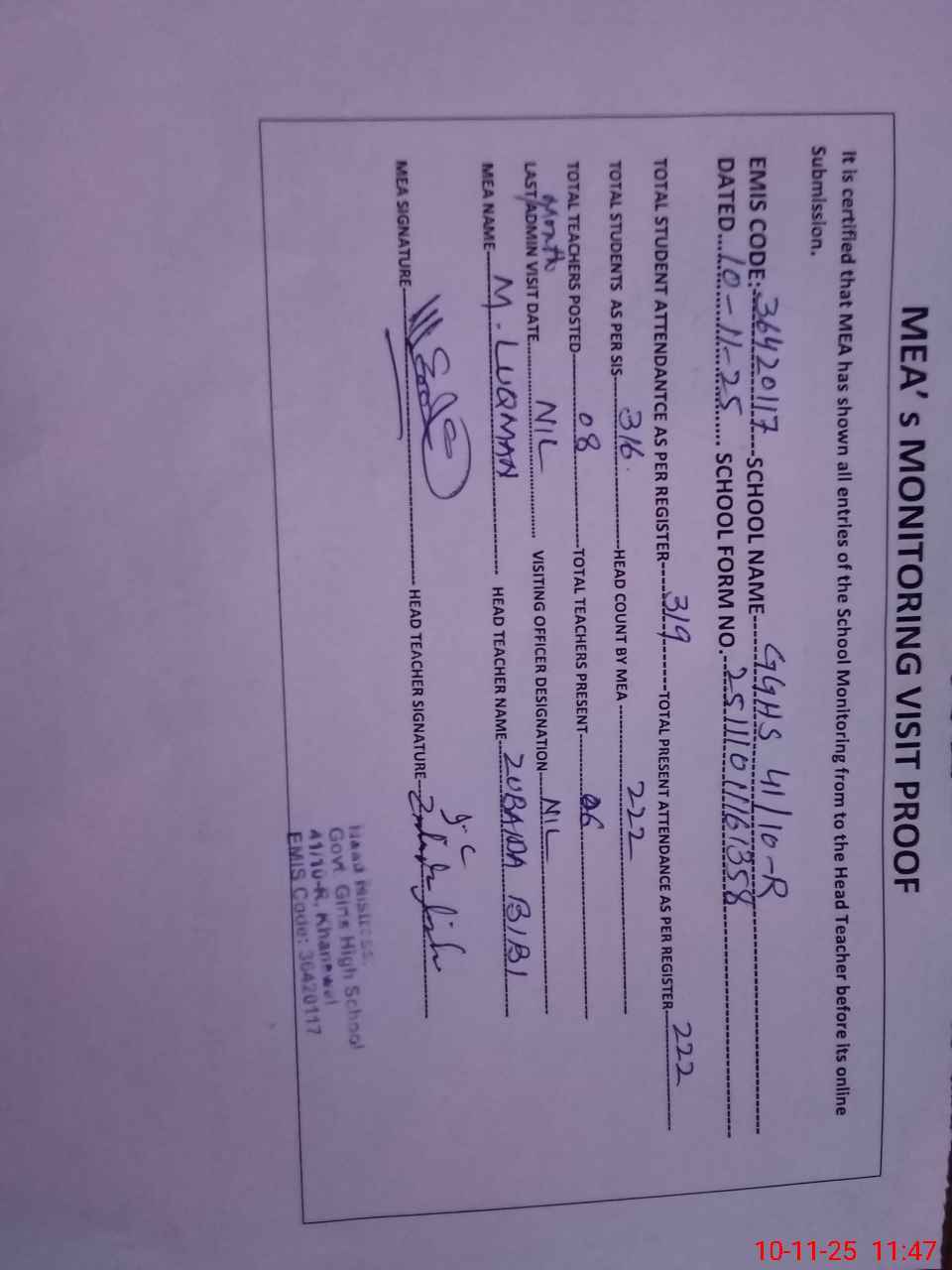 | Certified that this School was Inspected by the Undersigned MEA/DMO Today and the Information Stated Above is as Per Record. | |||||