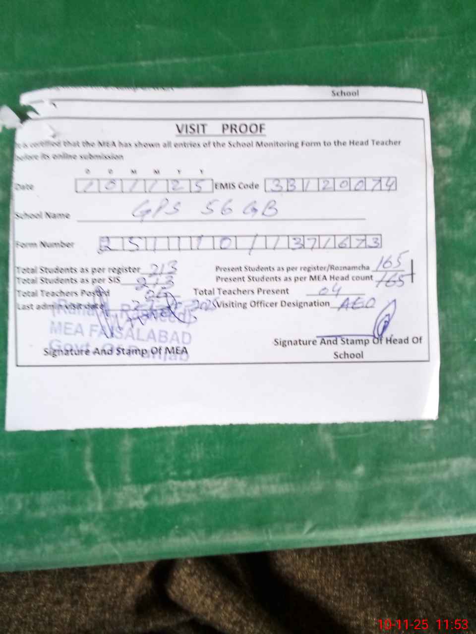 | Attendance Register | Head Teacher | MEA with School | Visit Proof |