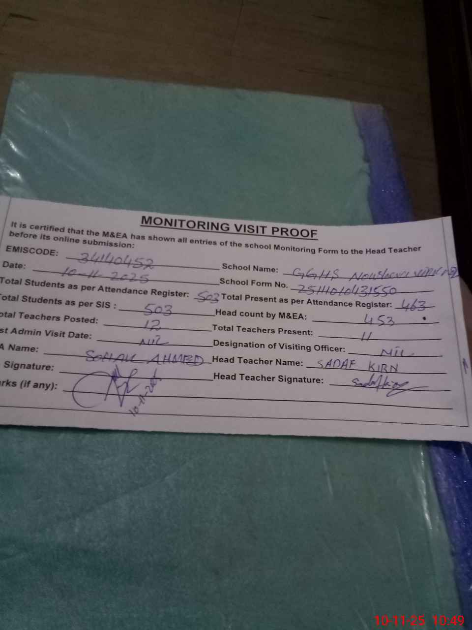 | Attendance Register | Head Teacher | MEA with School | Visit Proof |