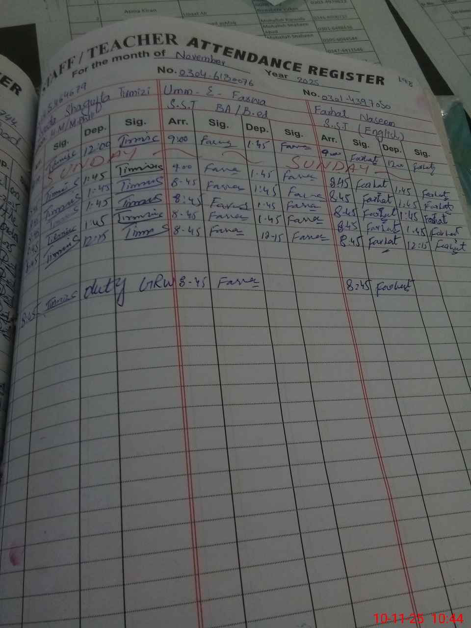 | CNIC | Full Name | Designation | R/C | Absence During Last Calender Month |
