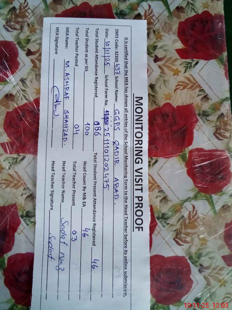 | Attendance Register | Head Teacher | MEA with School | Visit Proof |
