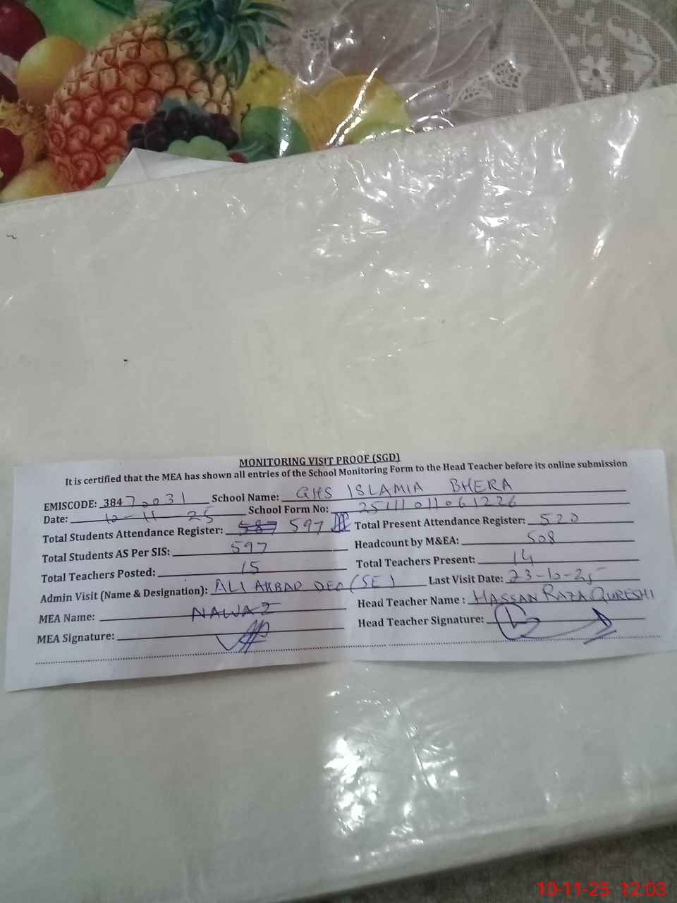| Attendance Register | Head Teacher | MEA with School | Visit Proof |