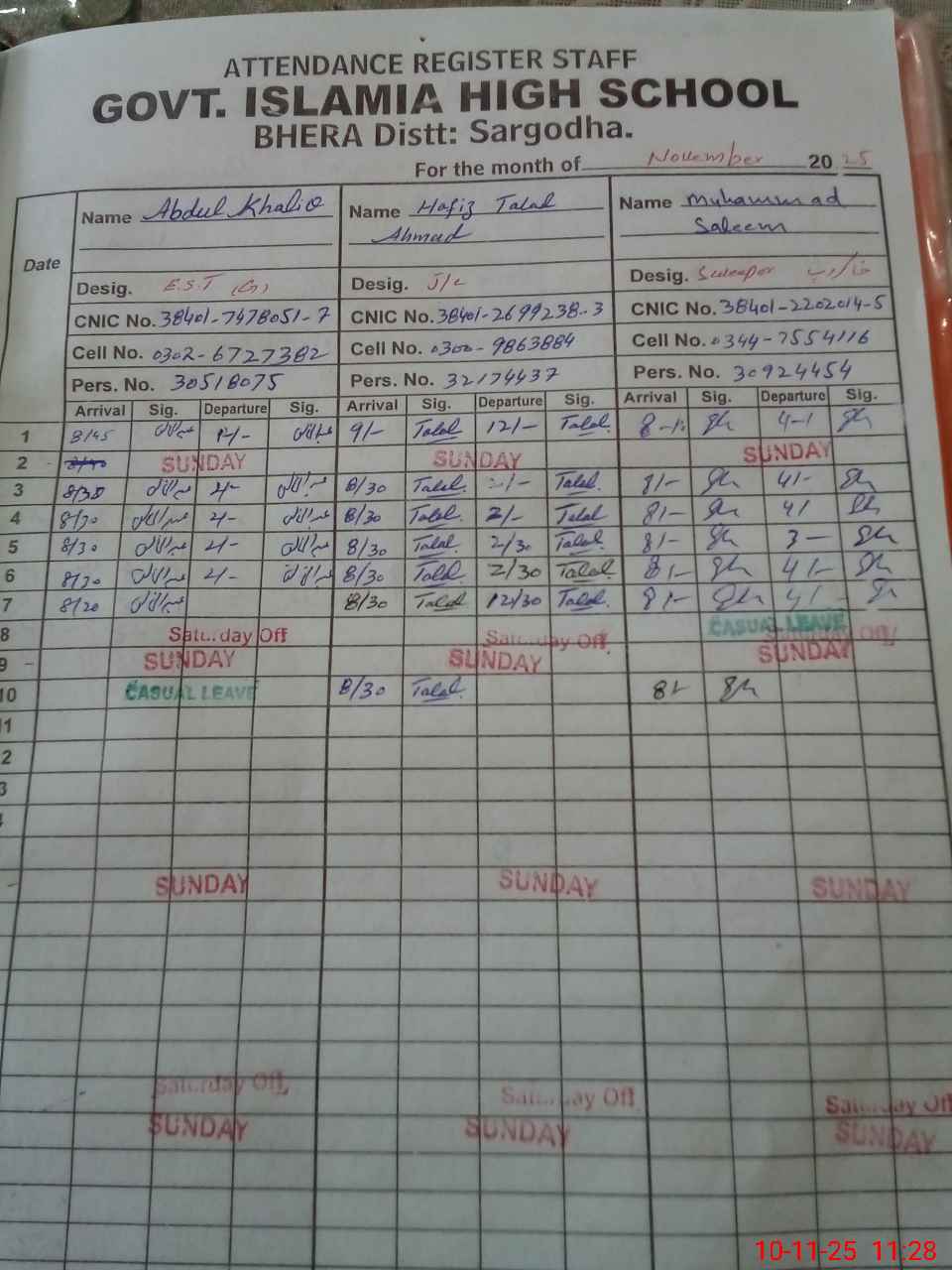 | CNIC | Full Name | Designation | R/C | Absence during last cal. month |