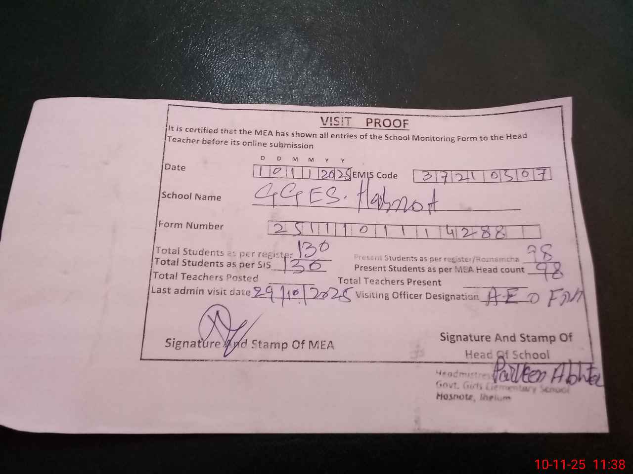| Attendance Register | Head Teacher | MEA with School | Visit Proof |