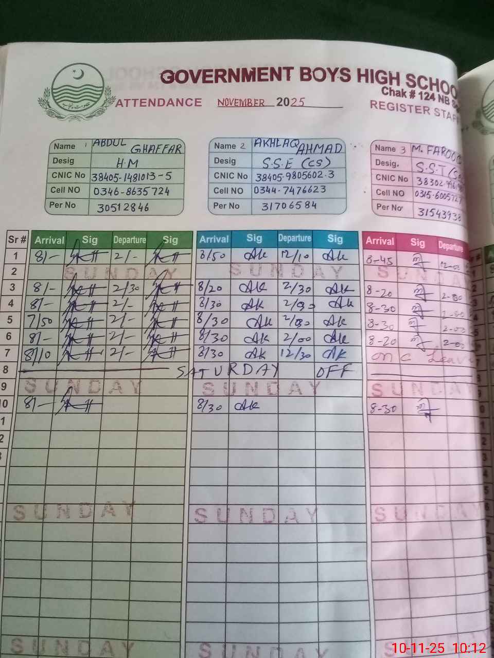 | CNIC | Full Name | Designation | R/C | Absence during last cal. month |