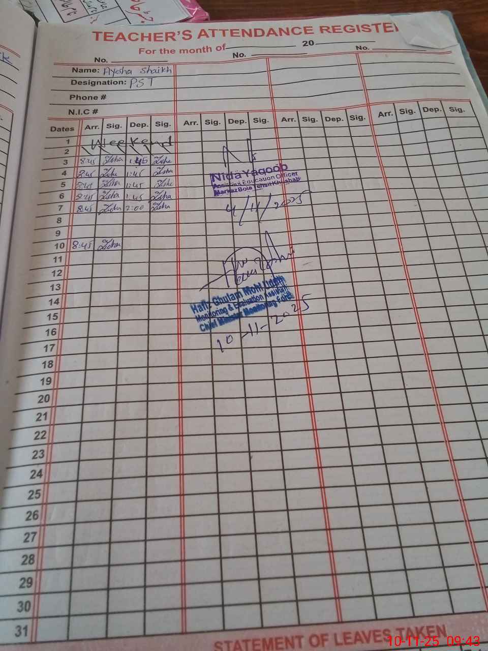 | Name: Ay**** Sh**** Designation: (School Headmaster's/Headmistress's) PST Phone/Cell Number: 03**** |