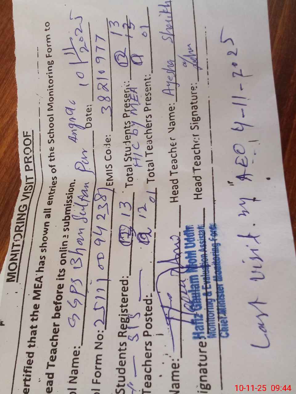 | Attendance Register | Head Teacher | MEA with School | Visit Proof |