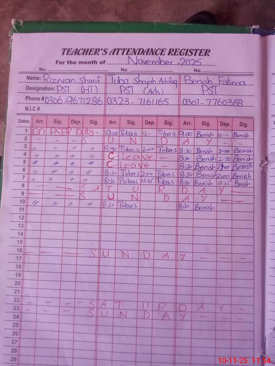 | Name: RI**** SH**** Designation: (School Headmaster's/Headmistress's) PST Phone/Cell Number: 03**** |