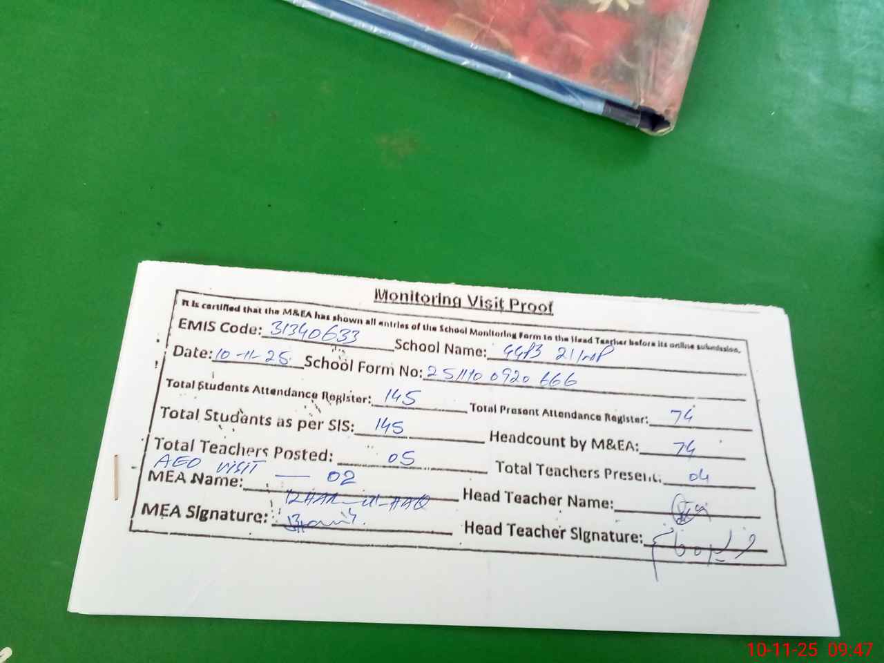 | EMIS Code: 31340663 | Name of School: GGPS 21/NP QADEEM GHULAM RASOOL | |||
