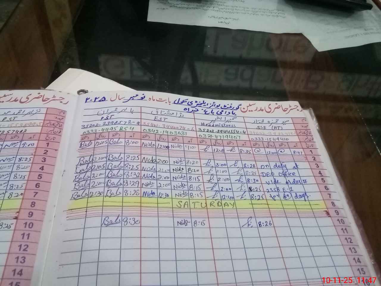 | Remarks (Use Separate Page if Required): 1 Muhammad Shakeel Ahmad NAIB QASID working with Deputy secretary planning from 1st June 2022 to 14th august 2025 no furthure order so mark him absent from duty 2 Syed Hamza Mukhtar SSE working in DEO MALE ELEMENTRY OFFICE since 12th January 2024 3 Two visit of admistrative in the month of October 20025 dated 2nd October 2025 and 28th October 2025 | |||||