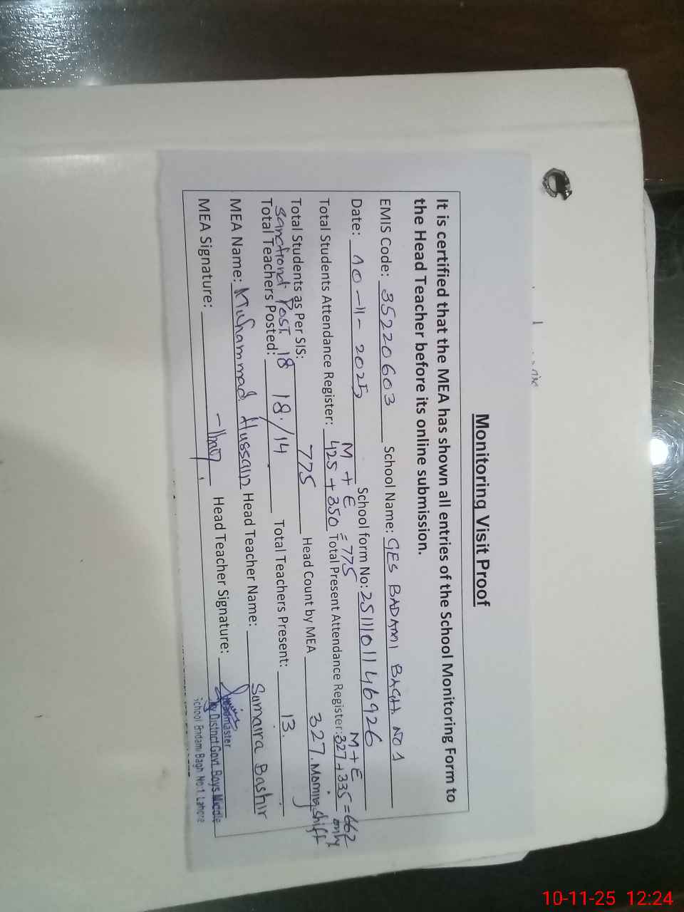 | Attendance Register | Head Teacher | MEA with School | Visit Proof |