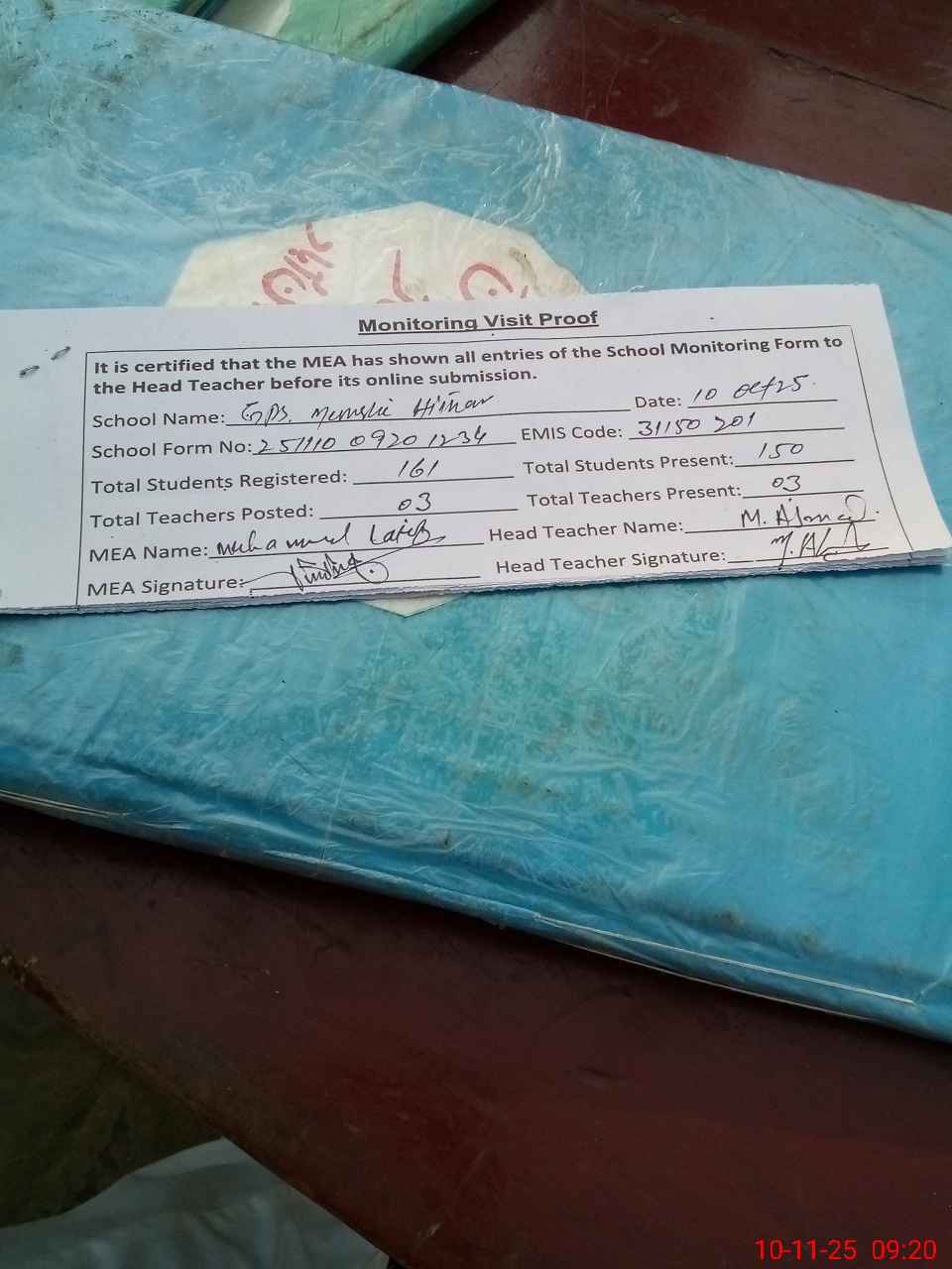 | Attendance Register | Head Teacher | MEA with School | Visit Proof |