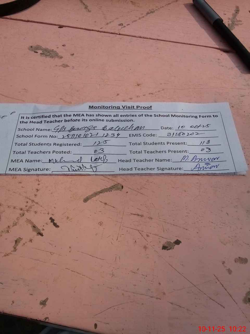 | Attendance Register | Head Teacher | MEA with School | Visit Proof |