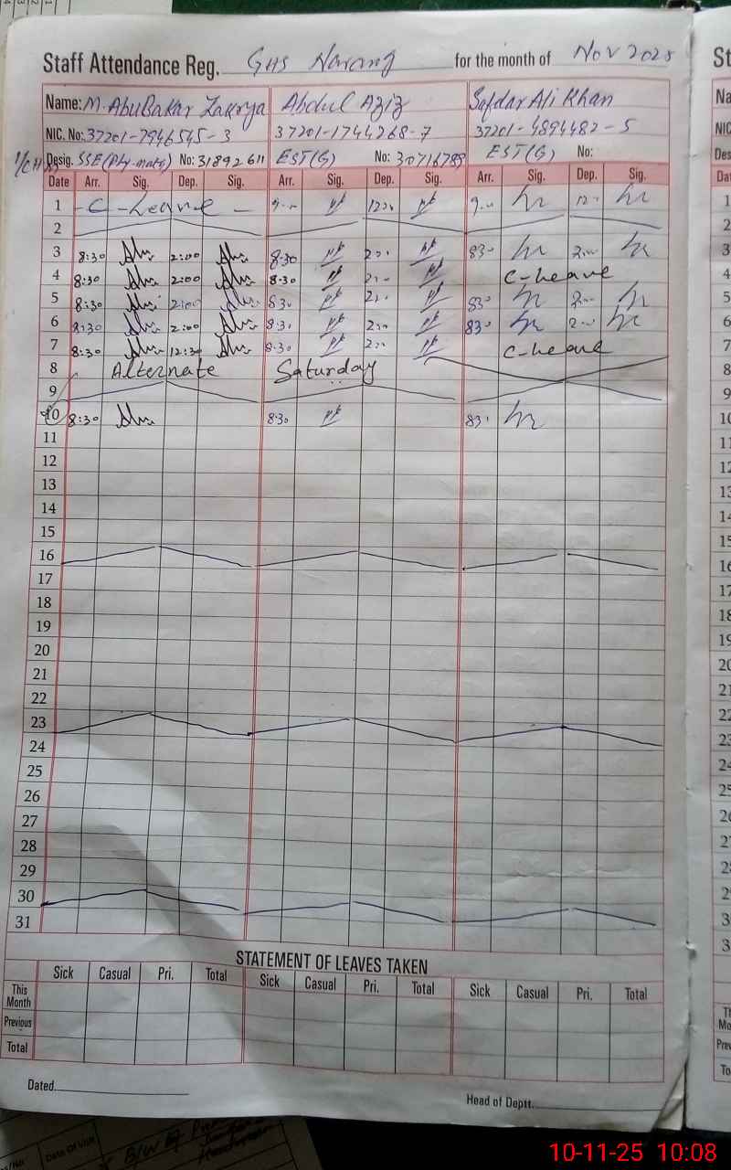 | CNIC | Full Name | Designation | R/C | Absence During Last Calender Month |