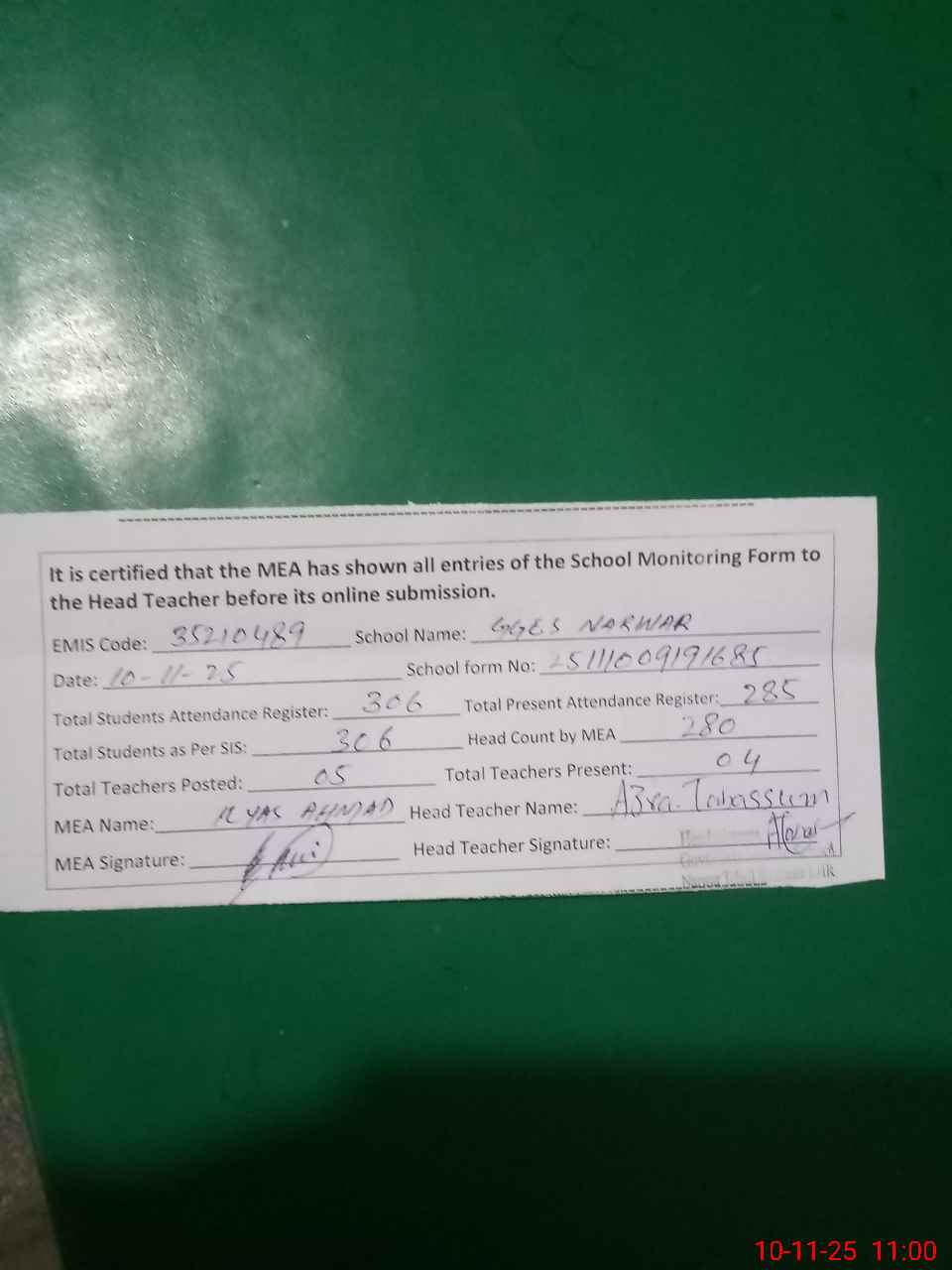 | Attendance Register | Head Teacher | MEA with School | Visit Proof |