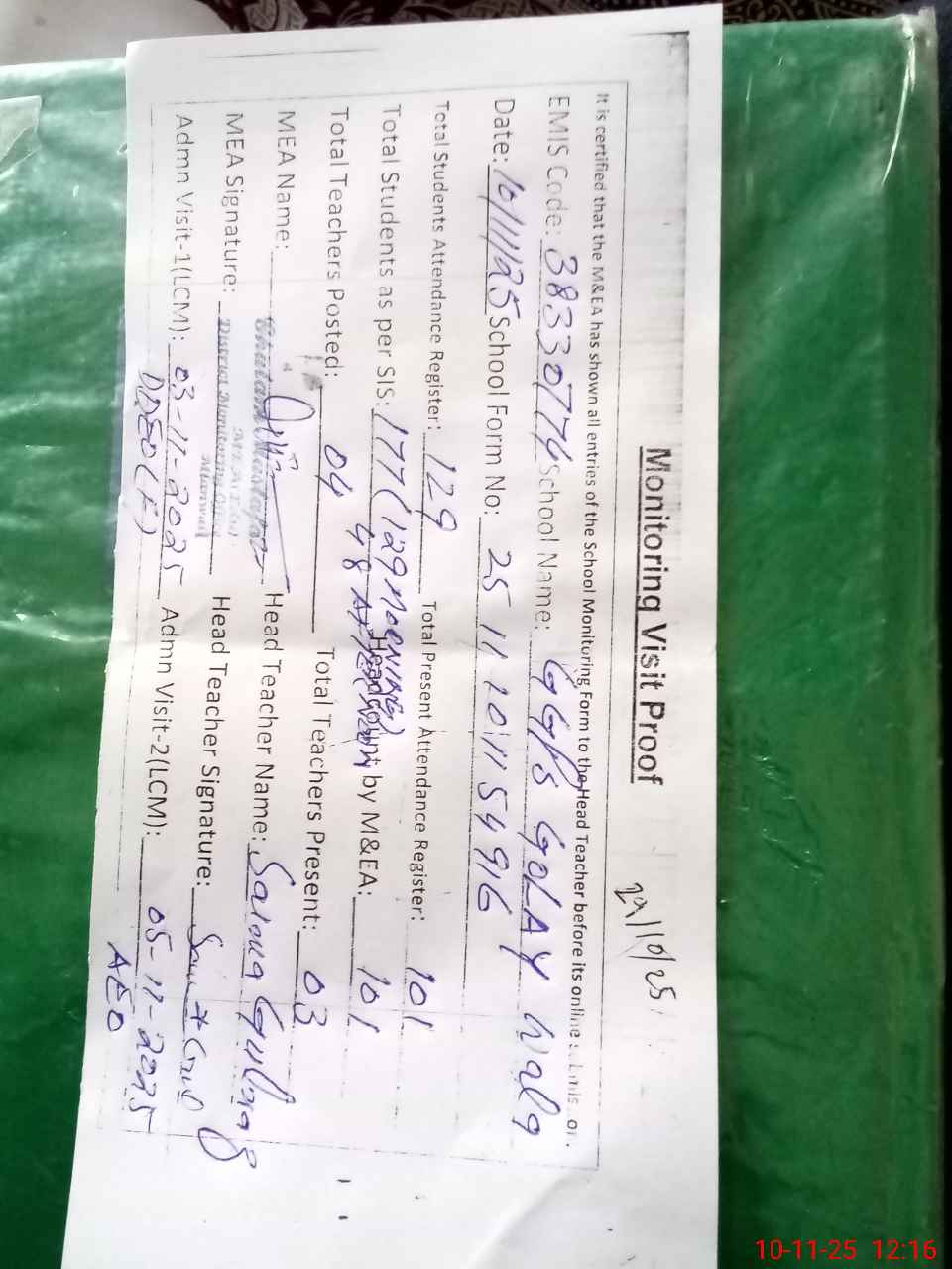 | Attendance Register | Head Teacher | MEA with School | Visit Proof |