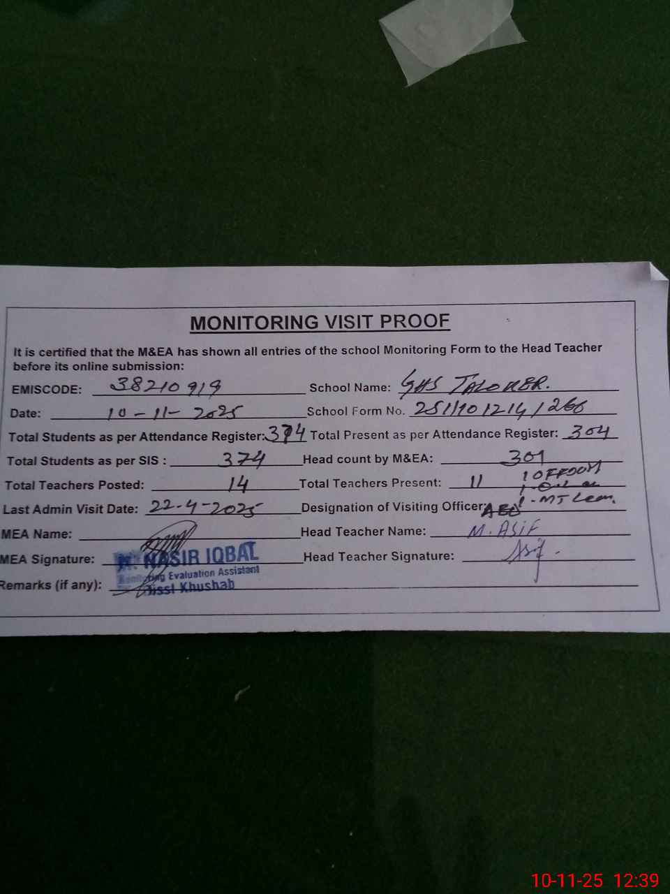 | EMIS Code: 38210919 | Name of School: GHS TALOKAR | |||