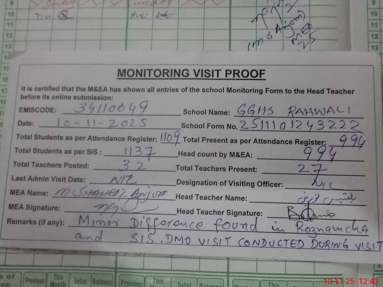 | Attendance Register | Head Teacher | MEA with School | Visit Proof |