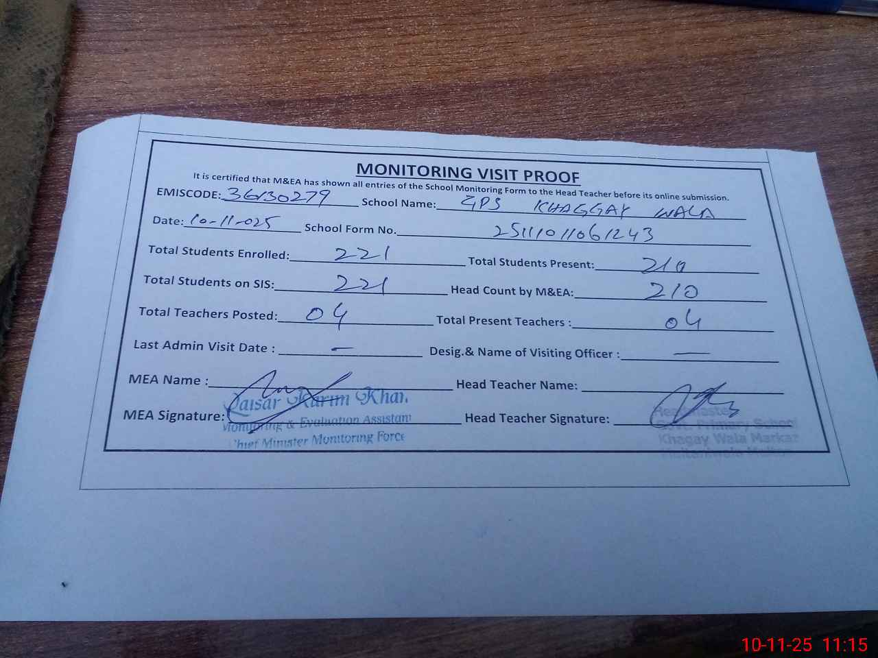 | EMIS Code: 36130279 | Name of School: GPS KHAGGAY WALA P/O ISLAM PUR | |||