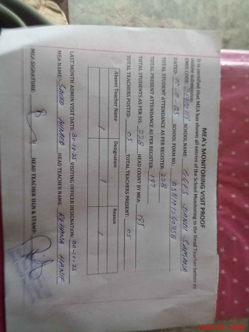 | Certified that this School was Inspected by the Undersigned MEA/DMO Today and the Information Stated Above is as Per Record. | |||||