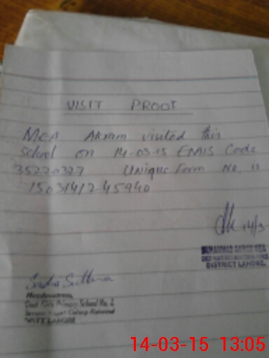 | Remarks (Use Separate Page if Required): HUMAIRA RIAZ PST POSTED IN THIS SCHOOL BEARING CNIC NO 3520291744276 under order no 1055 E 1 dsted 22nd march 2014 | |||||