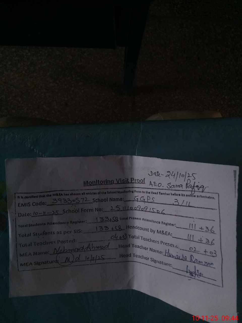 | Attendance Register | Head Teacher | MEA with School | Visit Proof |