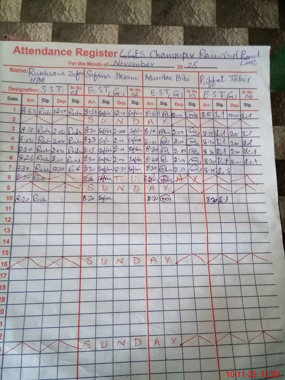 | Remarks (Use Separate Page if Required): 1 Amna Raza PST has been absent since 20 June 2025 to till date 2 Uzma Shahzadi PST is absent today 3 Waseem chowkidar shown on DEO office but written order not available so marked him absent | |||||