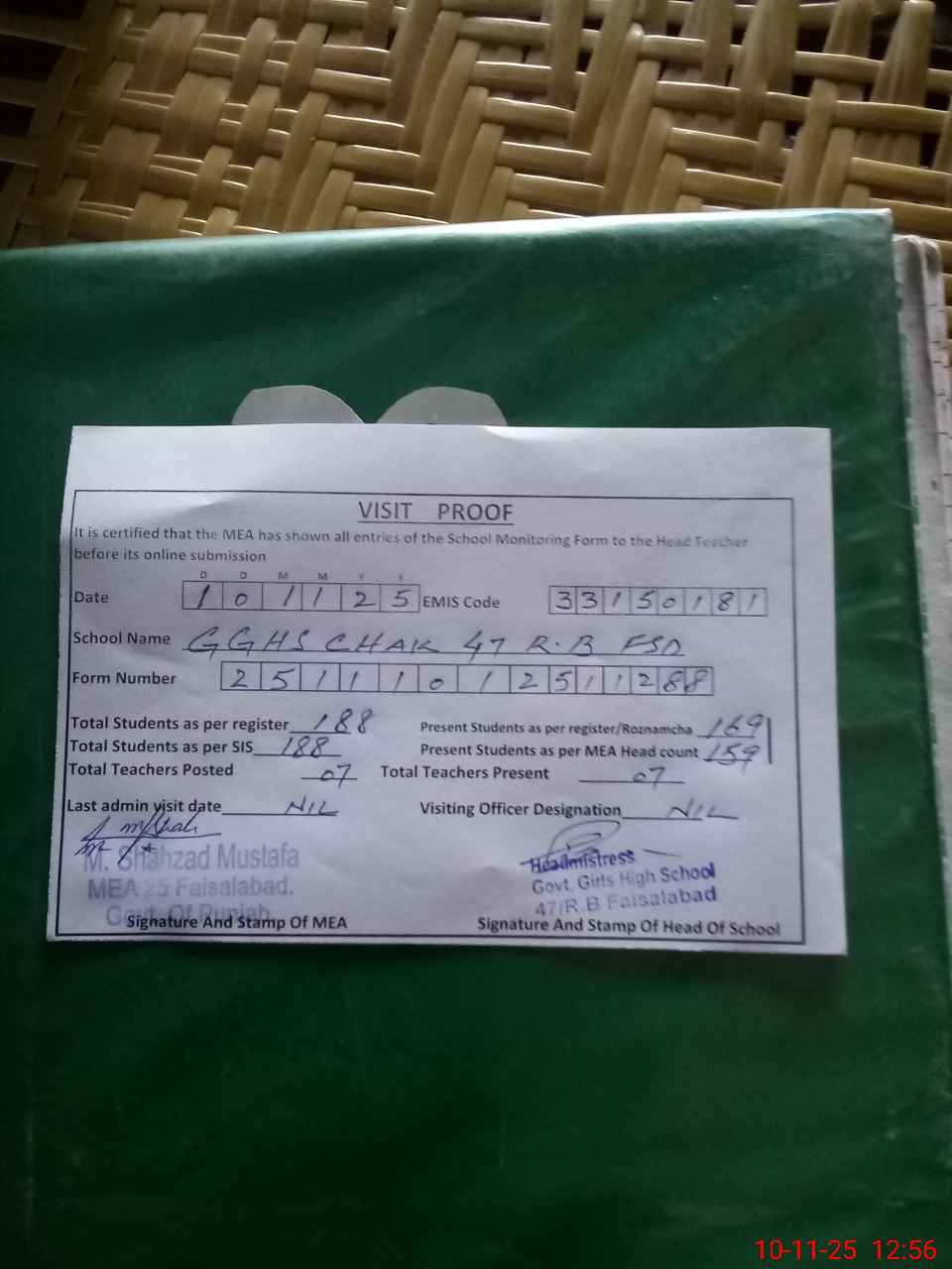 | Certified that this School was Inspected by the Undersigned MEA/DMO Today and the Information Stated Above is as Per Record. | |||||