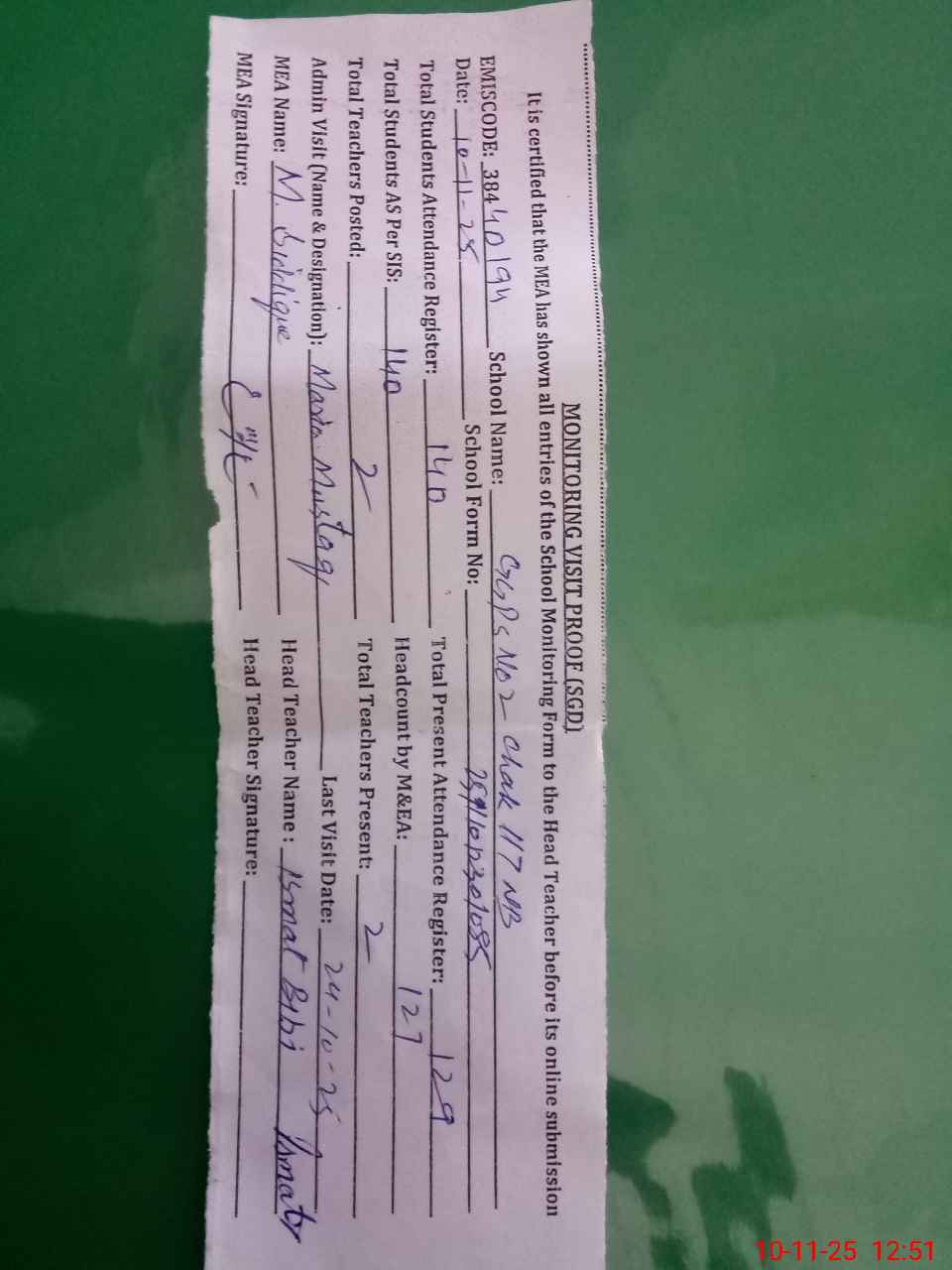 | Attendance Register | Head Teacher | MEA with School | Visit Proof |