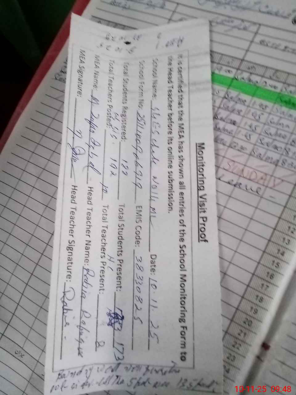 | Attendance Register | Head Teacher | MEA with School | Visit Proof |