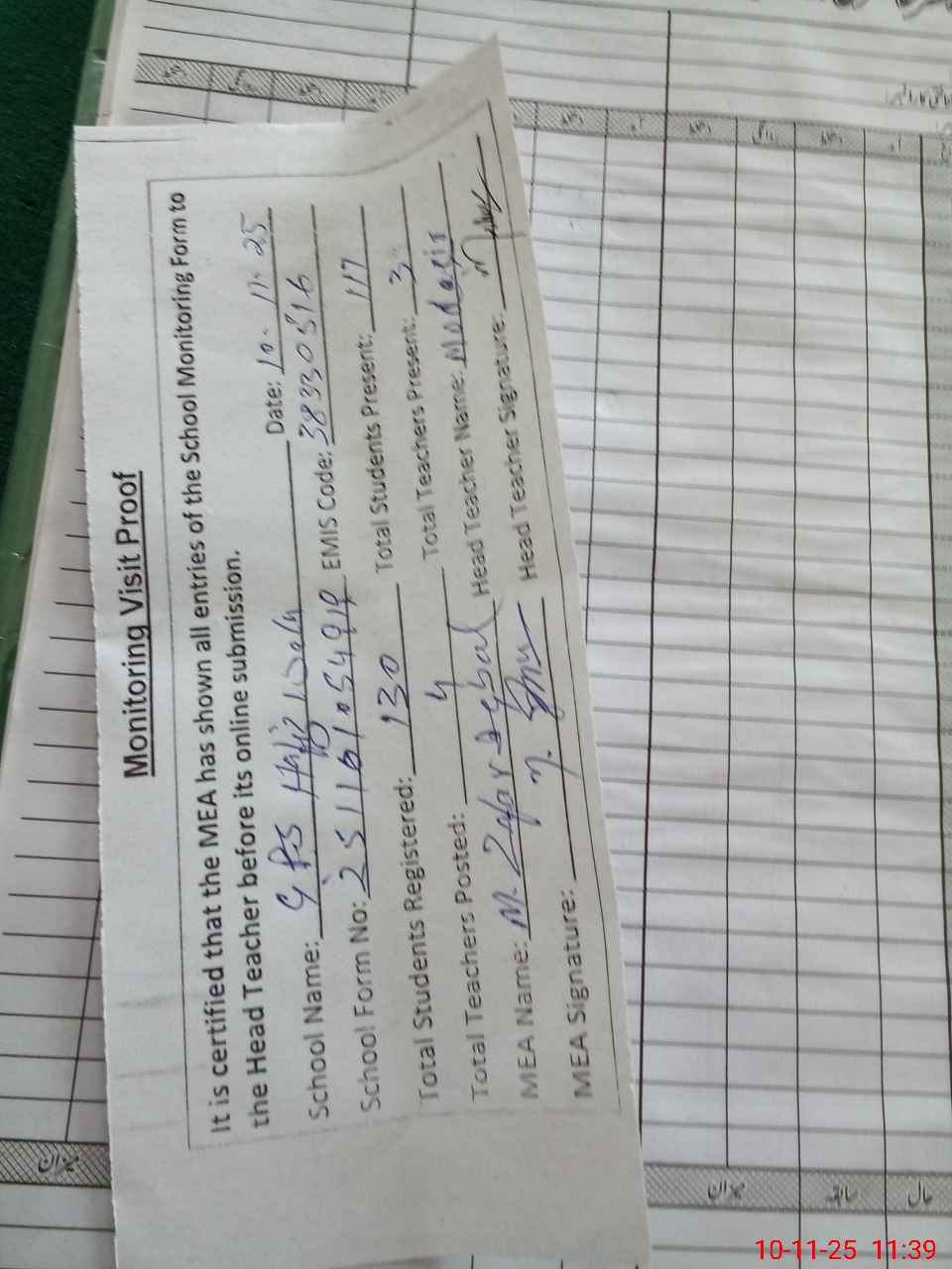 | Attendance Register | Head Teacher | MEA with School | Visit Proof |