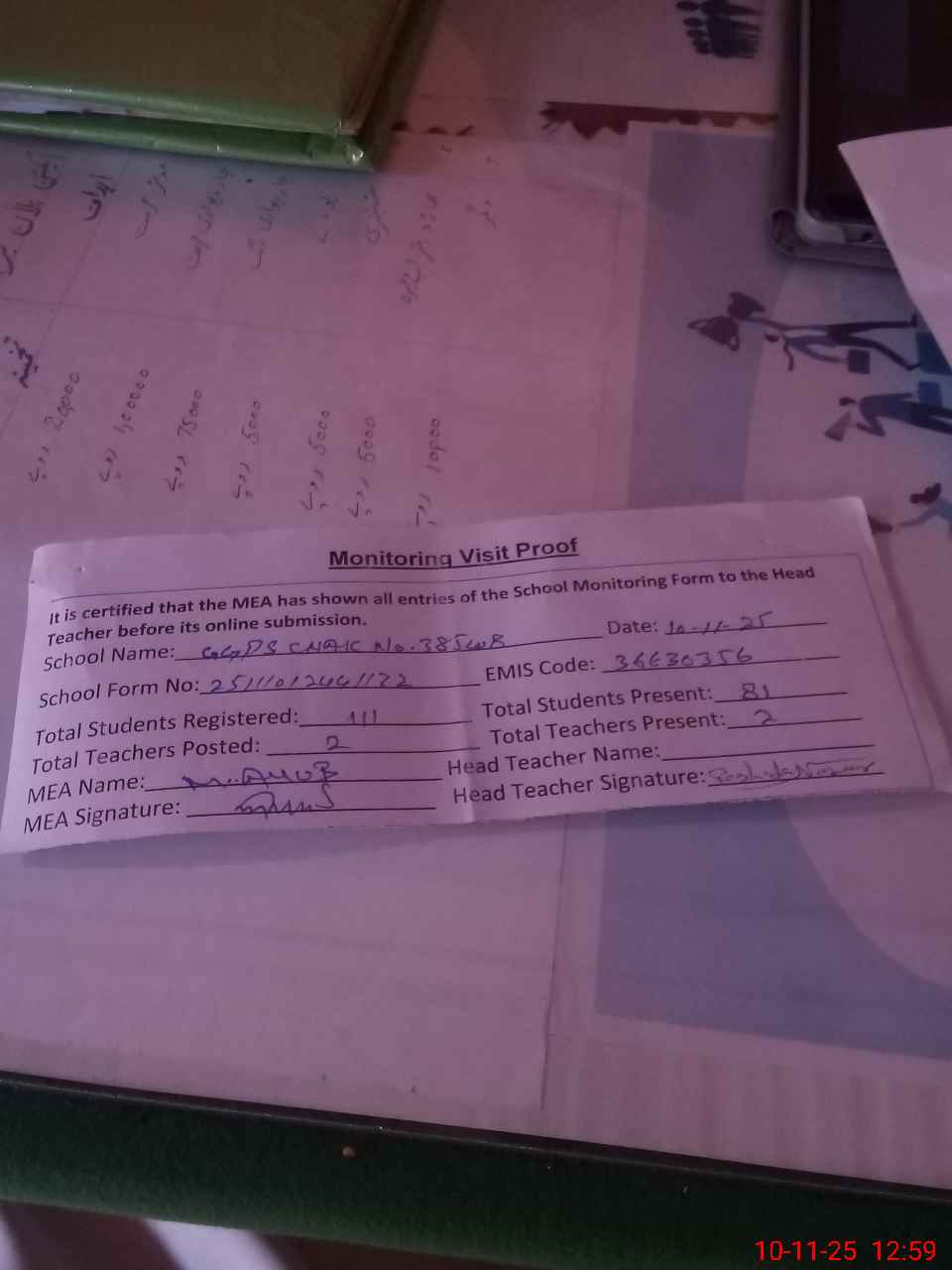 | Attendance Register | Head Teacher | MEA with School | Visit Proof |