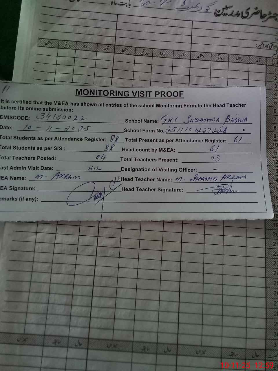 | Attendance Register | Head Teacher | MEA with School | Visit Proof |