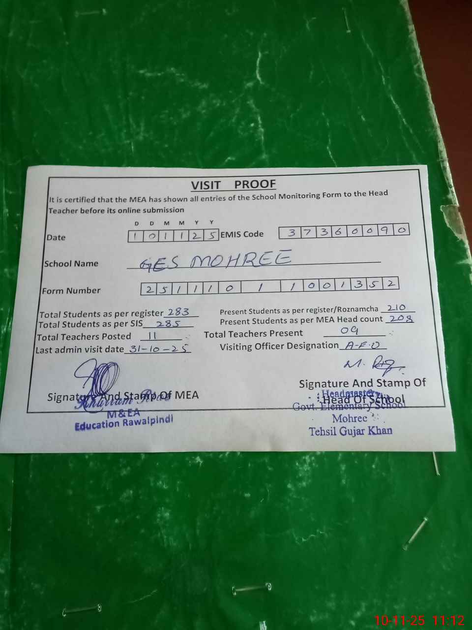 | Attendance Register | Head Teacher | MEA with School | Visit Proof |