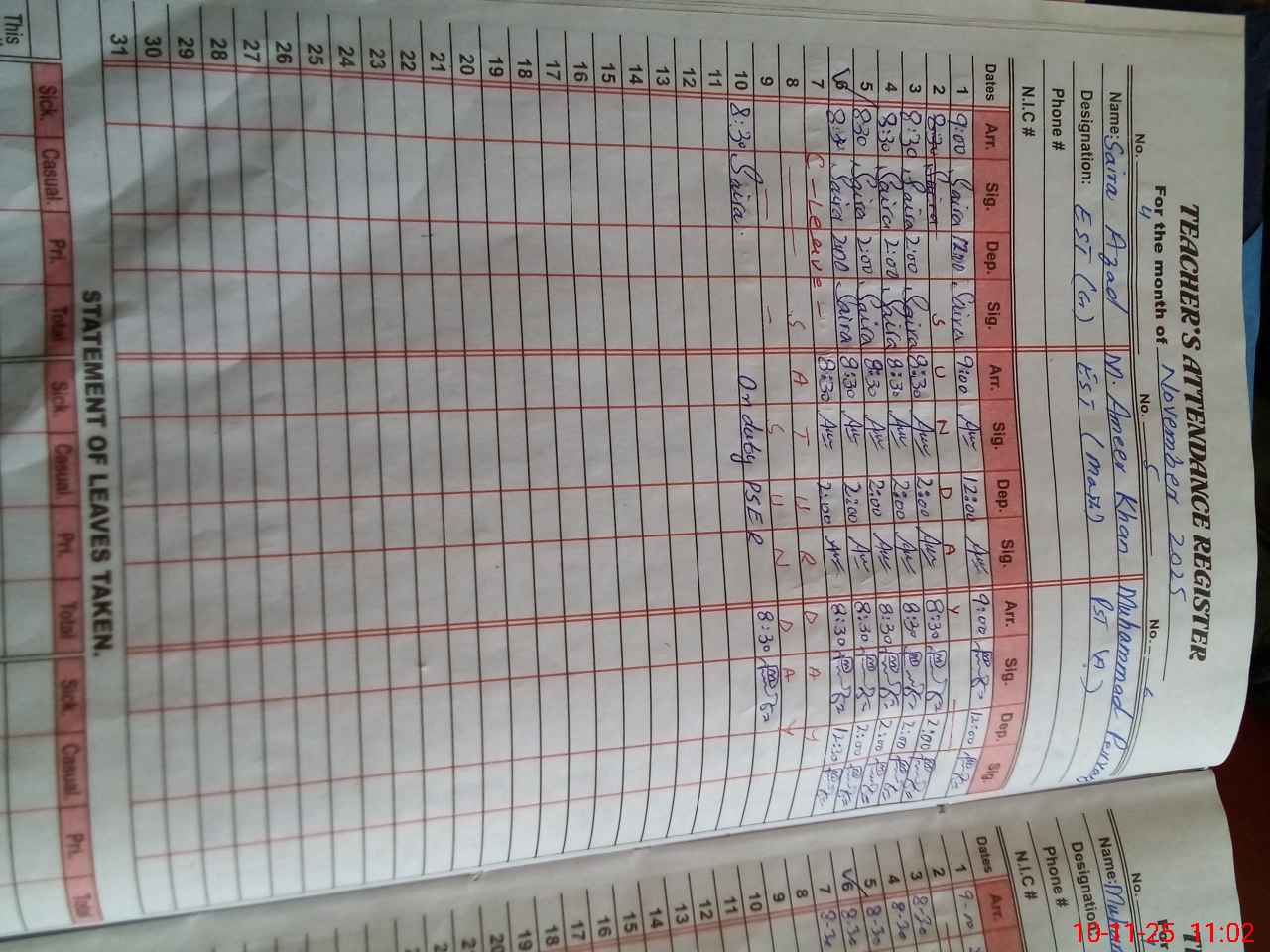 | CNIC | Full Name | Designation | R/C | Absence During Last Calender Month |