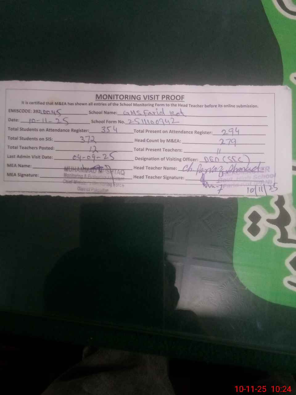 | Attendance Register | Head Teacher | MEA with School | Visit Proof |