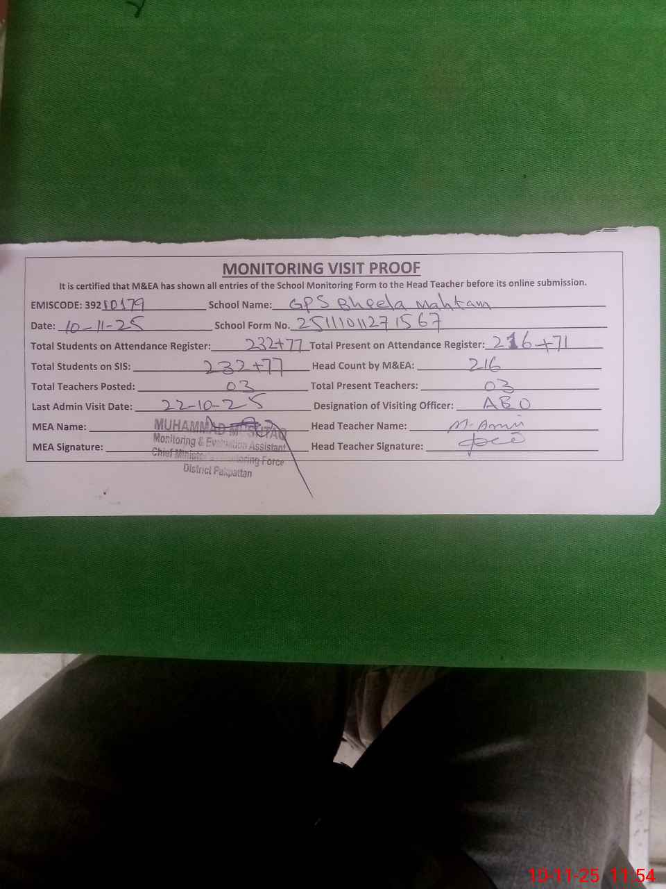 | Attendance Register | Head Teacher | MEA with School | Visit Proof |