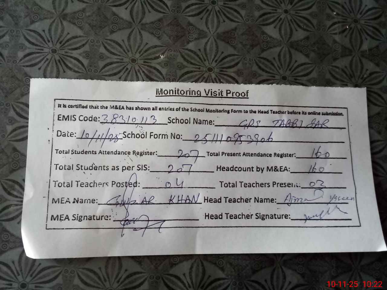 | Monitoring Date: 10-11-2025 | Start Time: 10-11-2025 09:52 AM | End Time: 10-11-2025 10:23 AM | Name of MEA: Gu**** Hu**** Kh**** | |