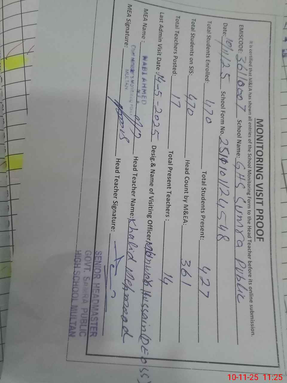 | Attendance Register | Head Teacher | MEA with School | Visit Proof |
