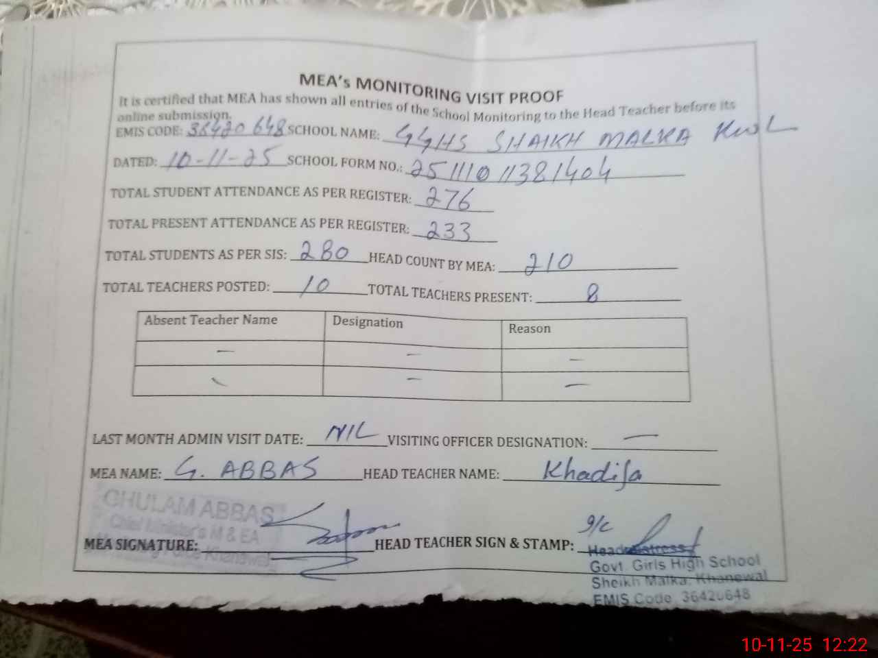 | EMIS Code: 36420648 | Name of School: GGHS SHEIKH MALKA | |||