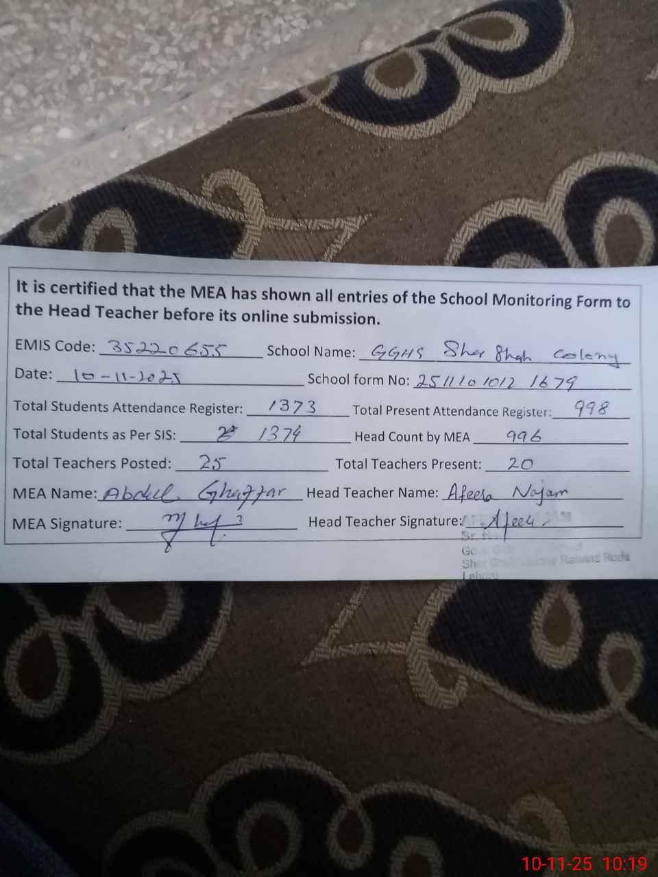 | EMIS Code: 35220655 | Name of School: GGHS SHER SHAH COLONY RAIWIND ROAD | |||