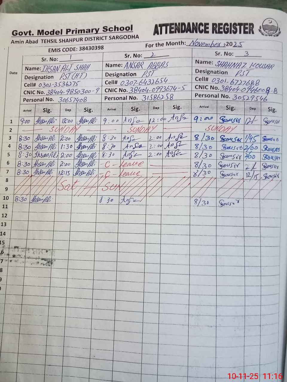 | CNIC | Full Name | Designation | R/C | Absence during last cal. month |